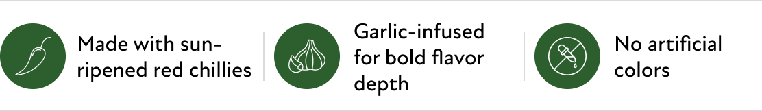 A hot sauce made from red chili, garlic, sugar, salt and spices cooked and bottled to deliver the signature sriracha taste. The sauce has a slightly sweet, tangy and garlicky flavour with smooth yet rich consistency.